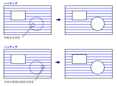 中抜きのないハッチング図形、すでに中抜きの領域があるハッチング図形にも新しい中抜き領域を追加することができます。