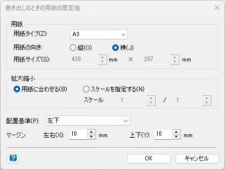 用紙上に図形がない図面で部分図を選択している状態で書き出しを実行したとき、自動的に部分図レイアウトを用紙に配置して書き出すときの既定値を設定します。